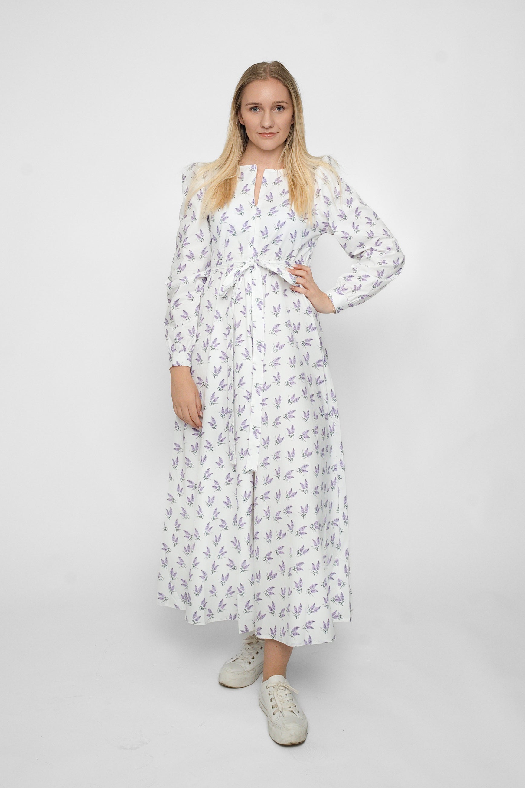 Klänningen är tillverkad av mjuk och andningsbar bomull som känns lätt och bekväm mot huden – perfekt för varma sommardagar eller med ull under på svalare kvällar.