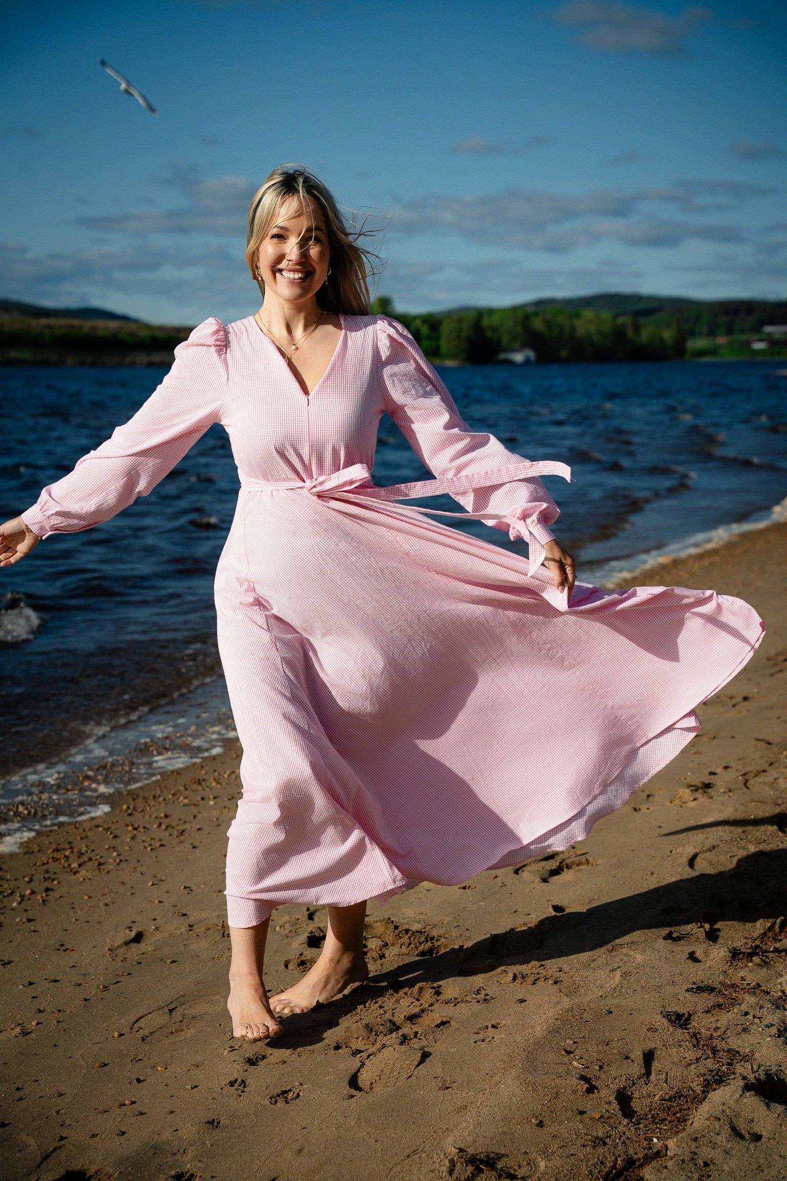 Klänningen är tillverkad av mjuk och andningsbar bomull som känns lätt och bekväm mot huden – perfekt för varma sommardagar eller med ull under på svalare kvällar.