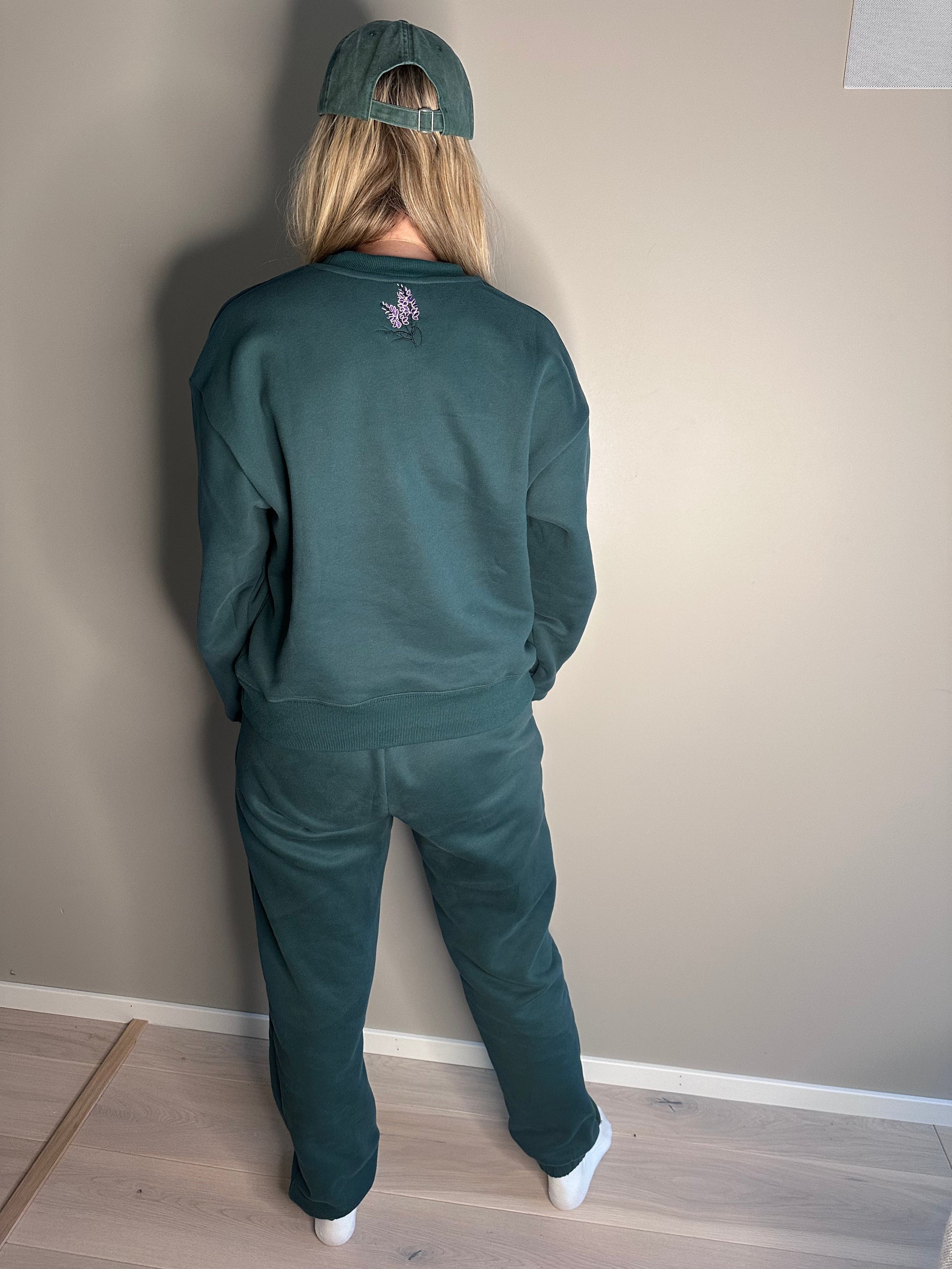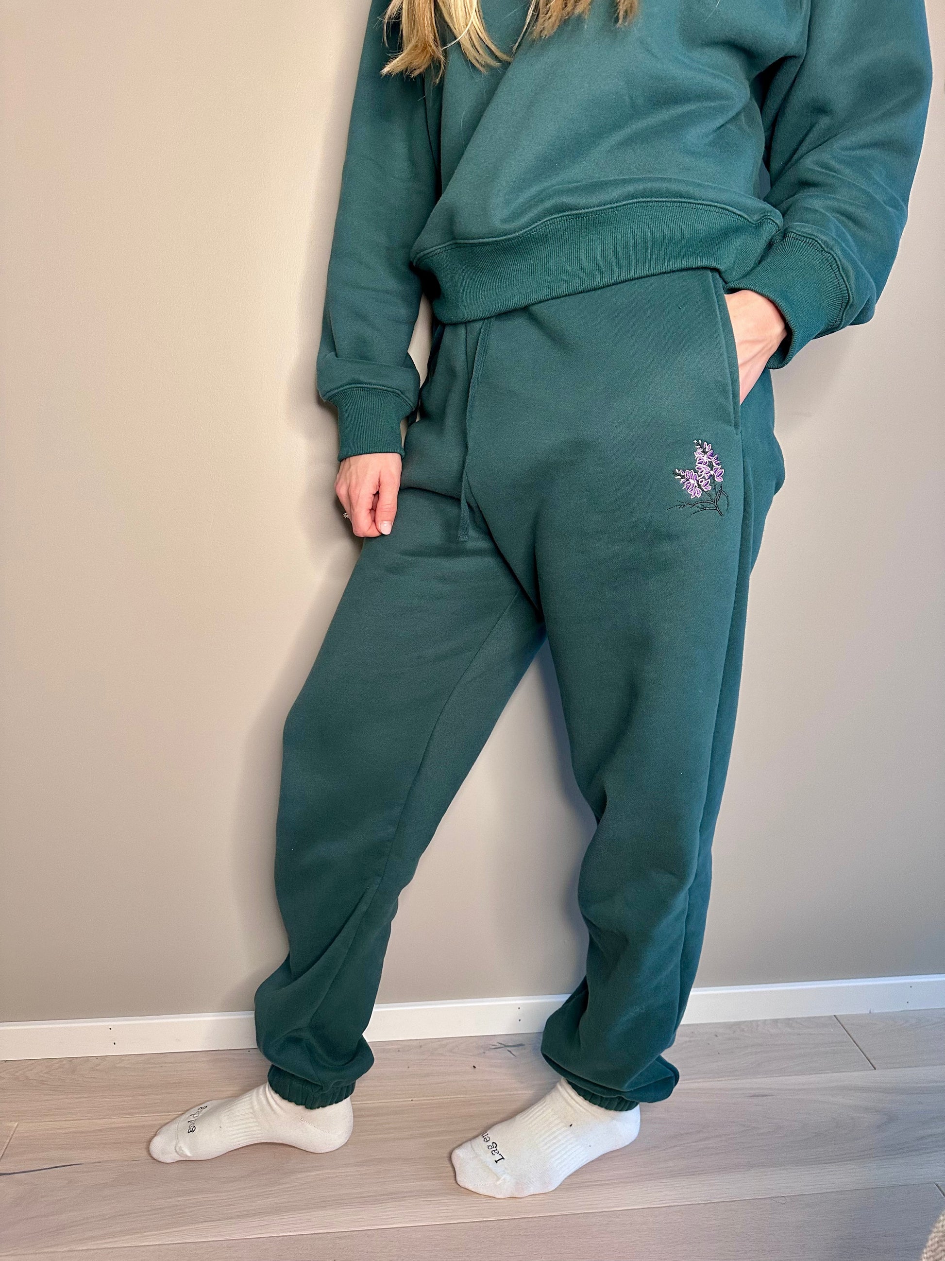 Broderade med vår signaturfärgade Ljungblomma på vänster ficka.